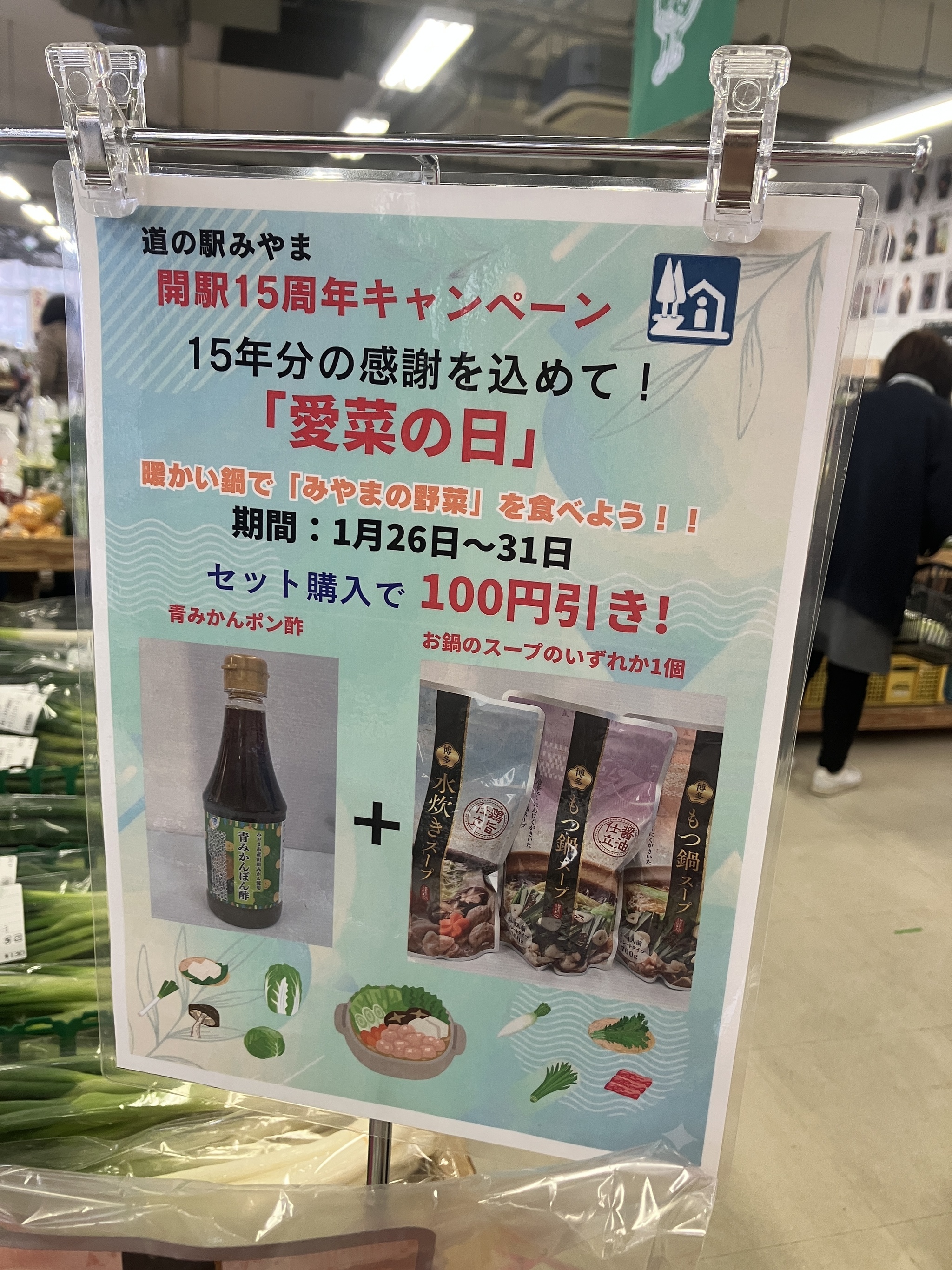 一覧へ戻る 道の駅15周年キャンぺ‐ン! 感謝を込めて!「愛菜の日」 キャンぺ‐ン開催中2026-01-31注目 3月に、道の駅みやまは、15周年をむかえます。「愛菜の日」キャンぺーン中!青みかんポン酢 + 鍋のスープのいずれか1つ「水炊き OR もつ鍋(醤油) OR もつ鍋(味噌)」 セット購入で100円引きのキャンペ-ンを行っております。お買得となっております。ぜひご購入ください。